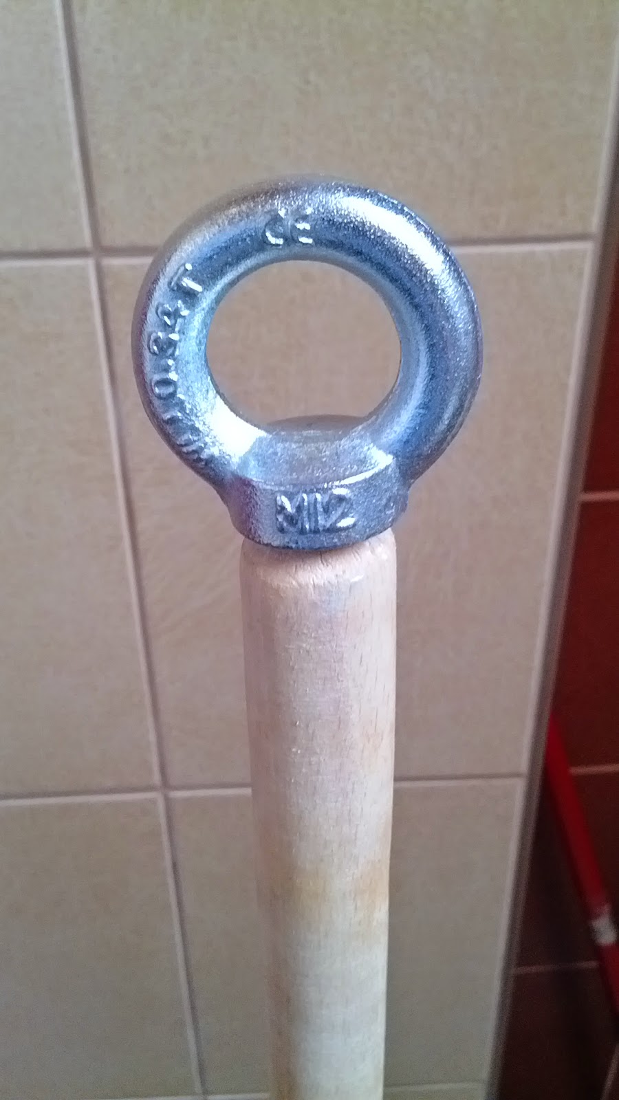 Simple wooden pole. It has no Bluetooth capabilities, nor an LCD screen. - In the same store, acquire a metal ringy-part called an eyebolt. I was googling for nearly an hour before I found how the damn thing is called in english. Mine is M12 - the inner circle/ring diameter is Ø 30 mm, and the outer ring size is Ø 55 mm. It is possible that a smaller one would do the trick - but not too much smaller.
